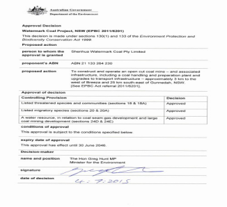 中国云顶国际沃特马克项目于 2015 年取得新州政府的《开发许可》和联邦环境部的环评批复,获得了澳洲矿业开发的核心审批。